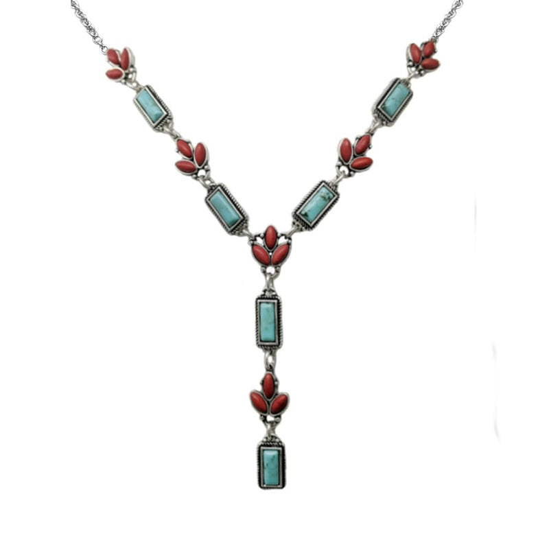 Western Y-Drop Necklace, Turquoise Howlite and Coral Red Stones, 18"+3" Extender, Silver