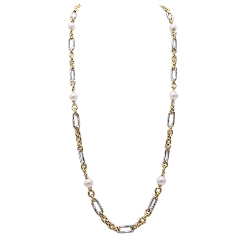 Two-Tone Link Chain Long Necklace, Gold and Silver with Pearl Accents, Toggle Clasp, 36"