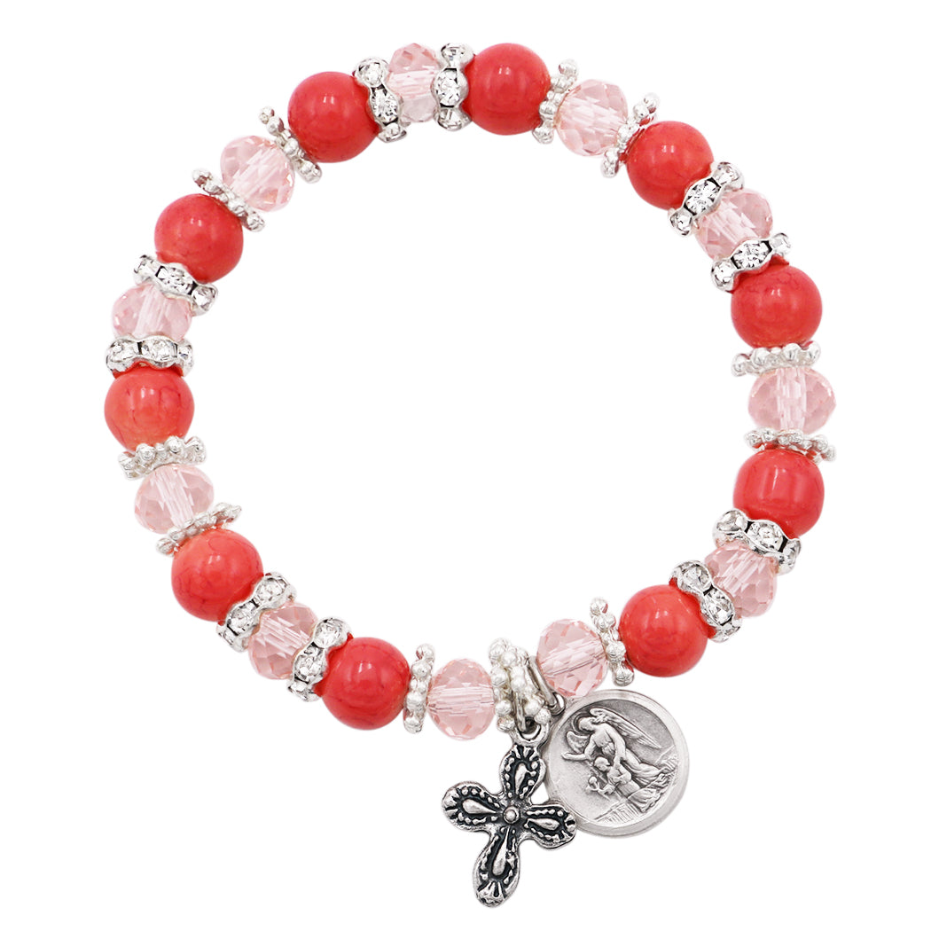 Women's Religious Guardian Angel Coral and Crystal Bead Stretch Bracelet