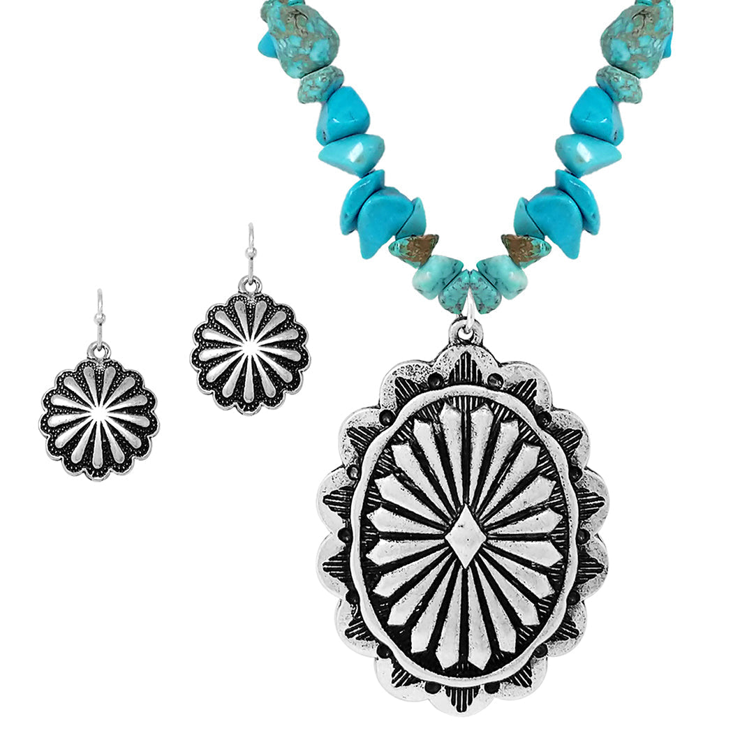 Cowgirl Chic Statement Turquoise Howlite Stone Strand Western Concho Pendant Necklace Earrings Set, 19"+3" Extender