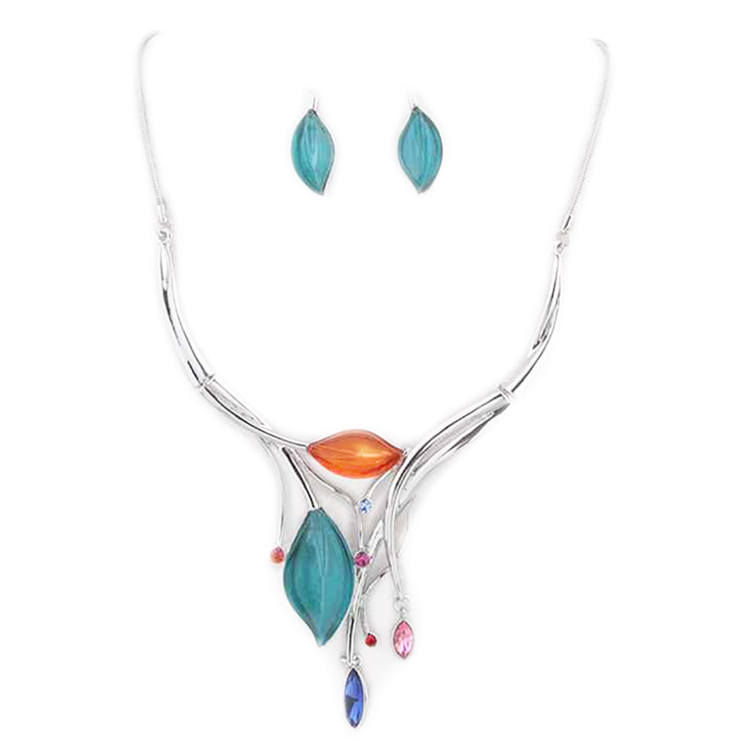 Leaf Design Statement Bib Necklace Earrings Set, 14"-17" with 3" Extender (Silver Tone Aqua And Orange)