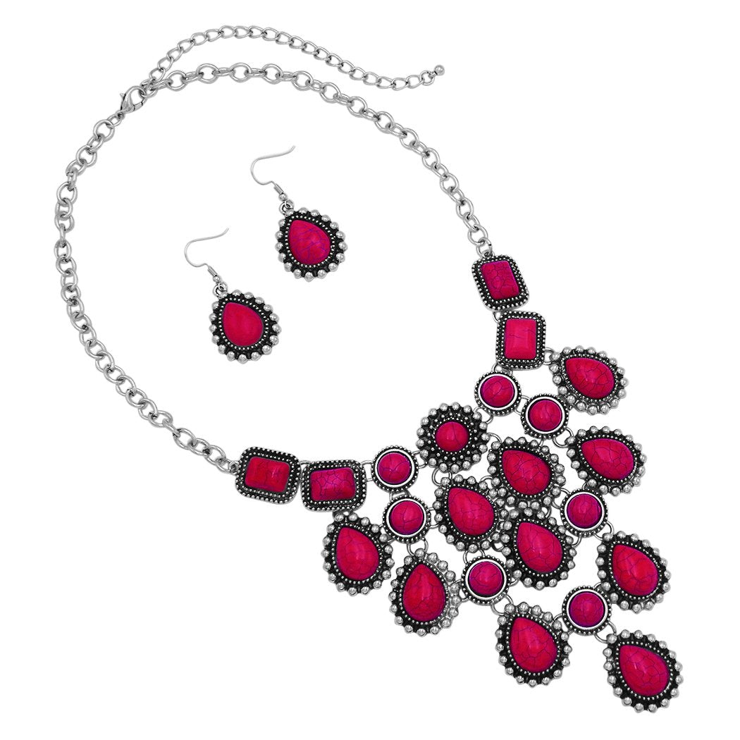 Rosemarie Collections Women’s Boho Natural Howlite Stone Dangle Statement Bib Necklace Drop Earrings Jewelry Set, 18"-21" with 3" Extender (Red)