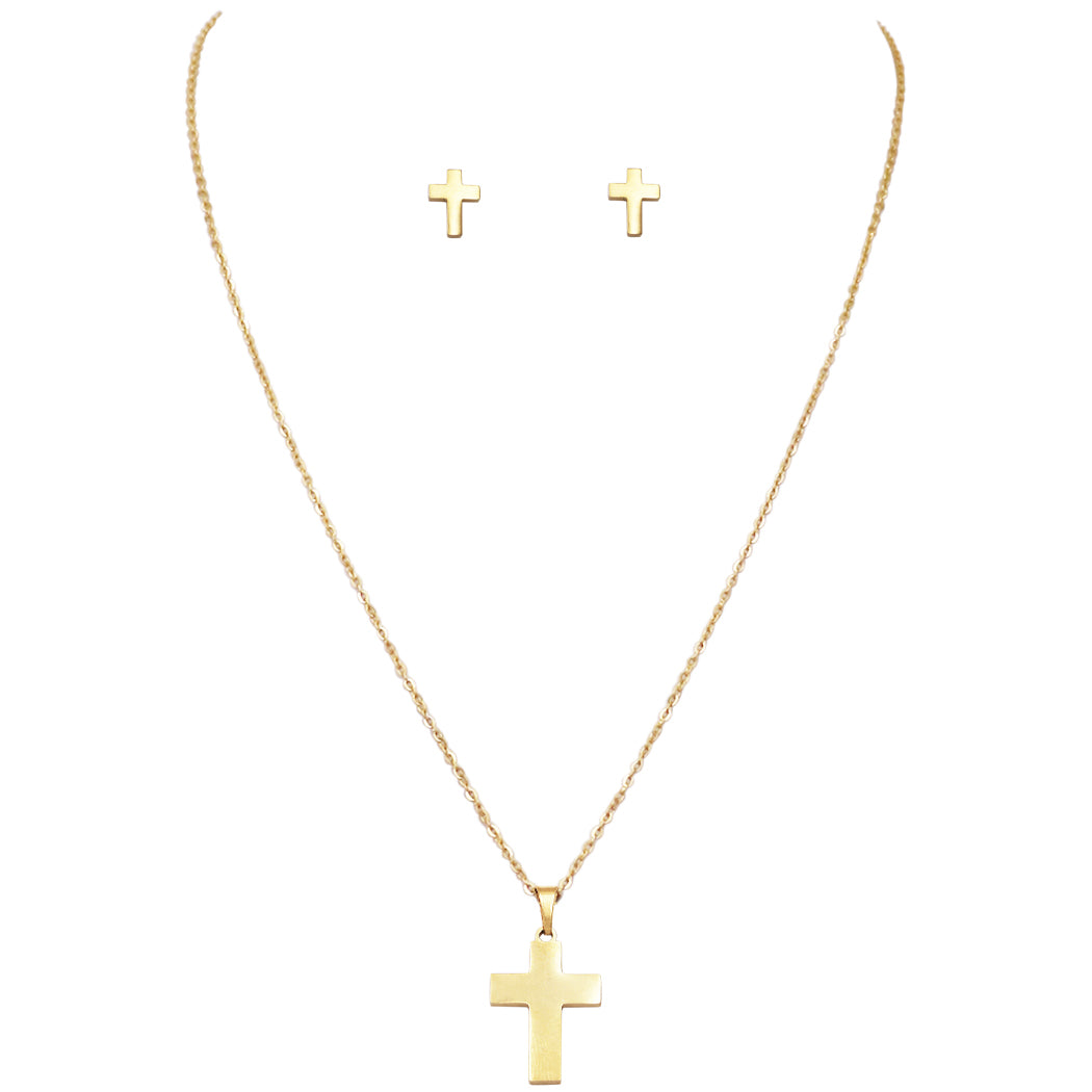 Stainless Steel Cross Charm Necklace and Earrings Set (Gold Tone)