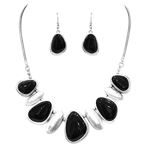 Unique Contemporary Polished Silver Tone Western Style Natural Howlite Necklace Earrings Set, 18"+3" Extension (Jet Black)