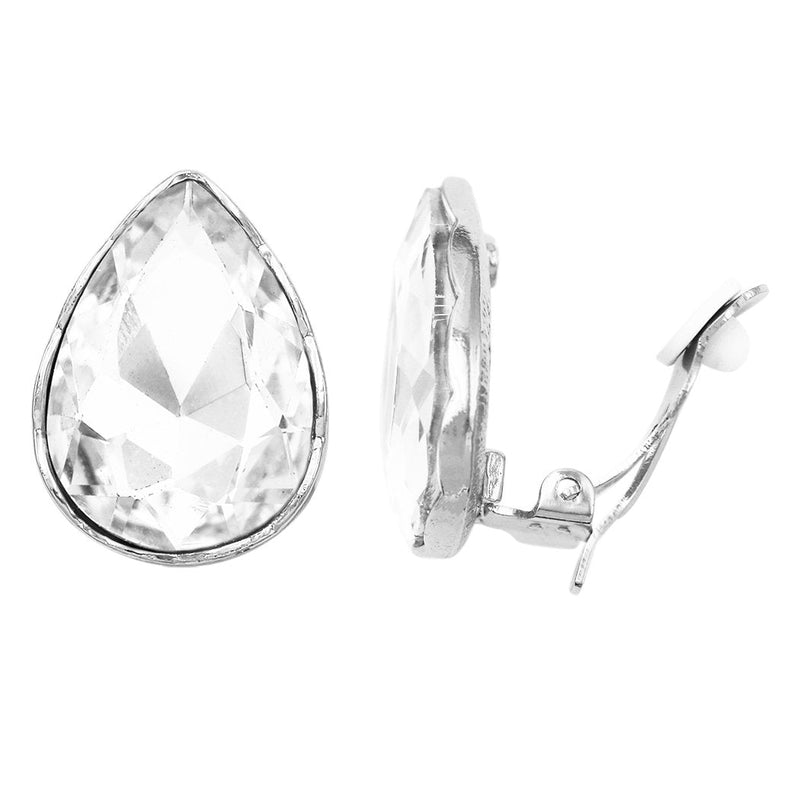 Statement Teardrop Crystal Clip On Earrings (Clear Crystal/Silver Tone)