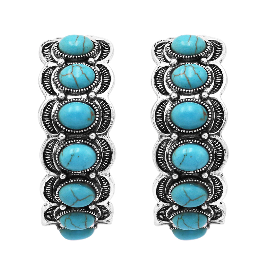Unique South Western Style Semi Precious Howlite Hammered Metal Oval Hoop Earrings, 2.25" (Turquoise)