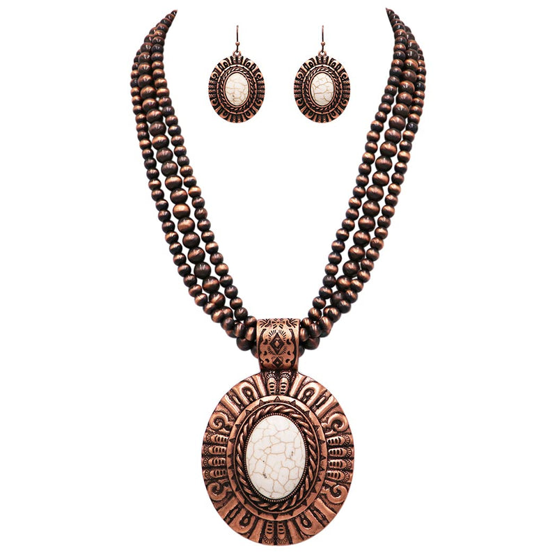 Cowgirl Chic Statement Burnished Silver Howlite Concho Pendant On Multi Strand Western Metallic Pearl Necklace Earrings Set, 20"+3" Extender