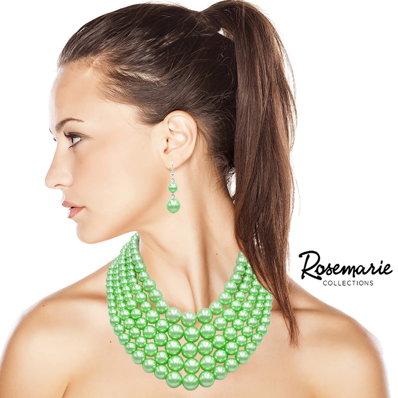 • Stunning and colorful five strand simulated pearl necklace and earring fashion jewelry set. Necklace has five lustrous strands of beads graduated in size from 15.5mm down to 7.5mm that drape across the chest in a bib style. Three inches of adjustable extension chain help you achieve the prefect fit.
