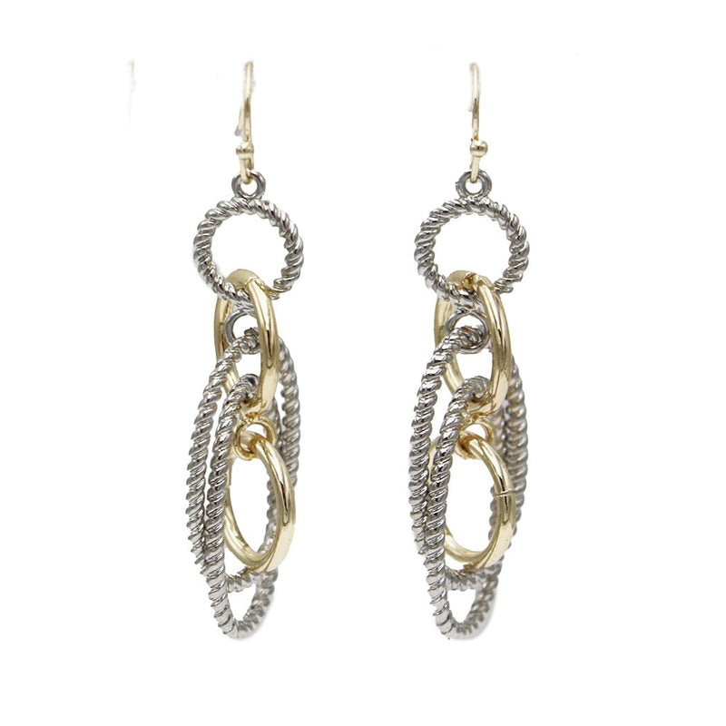 Two Tone Textured Geometric Multi Hoop Drop Dangle Earrings, Silver and Gold, 2 Inch Length