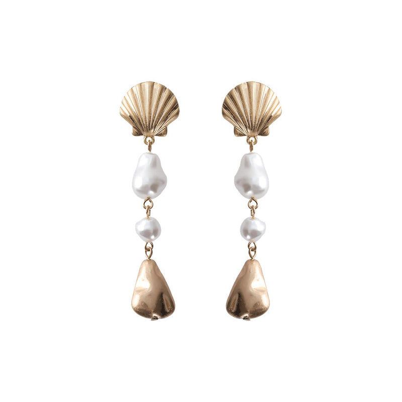 Vintage Shell Earrings with Faux Pearl and Gold Tone Nugget Drops, 3 Inch Length, Nautical Style Dangle