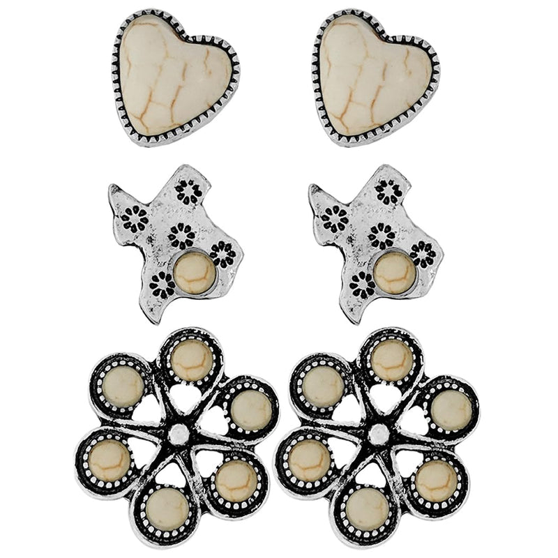 Western Earrings Set of 3 Pairs, Texas, Heart and Floral Design, Silver Tone with Natural Howlite