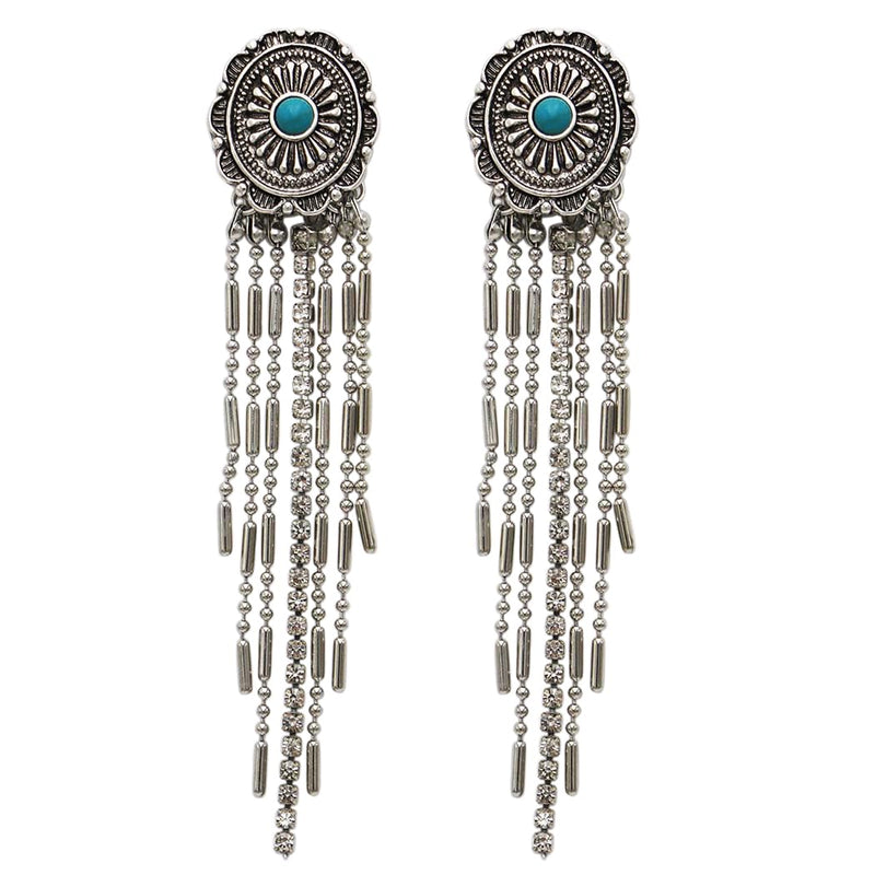 Vintage Turquoise Howlite Center Concho Earrings, Antique Silver Crystal Fringe Dangle, Western Style, 3.5 Inch Length