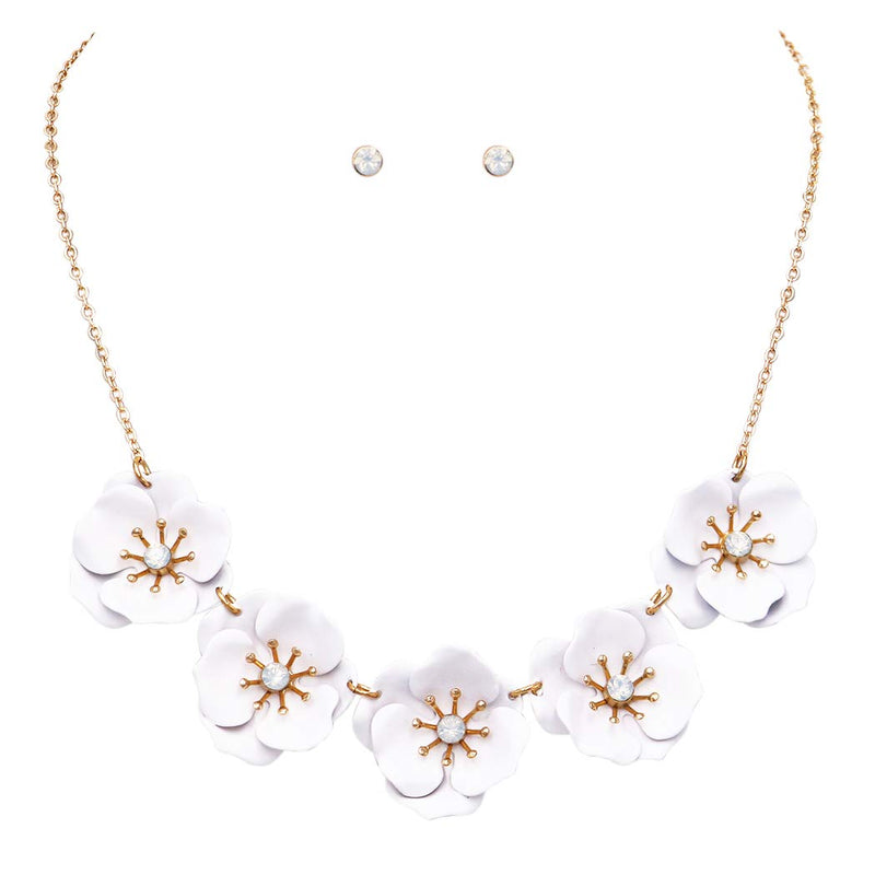 Colorful Powder Coated Flower With Crystal Rhinestone Center Collar Necklace Earrings Set, 15"+3" Extender (5 Flower White)
