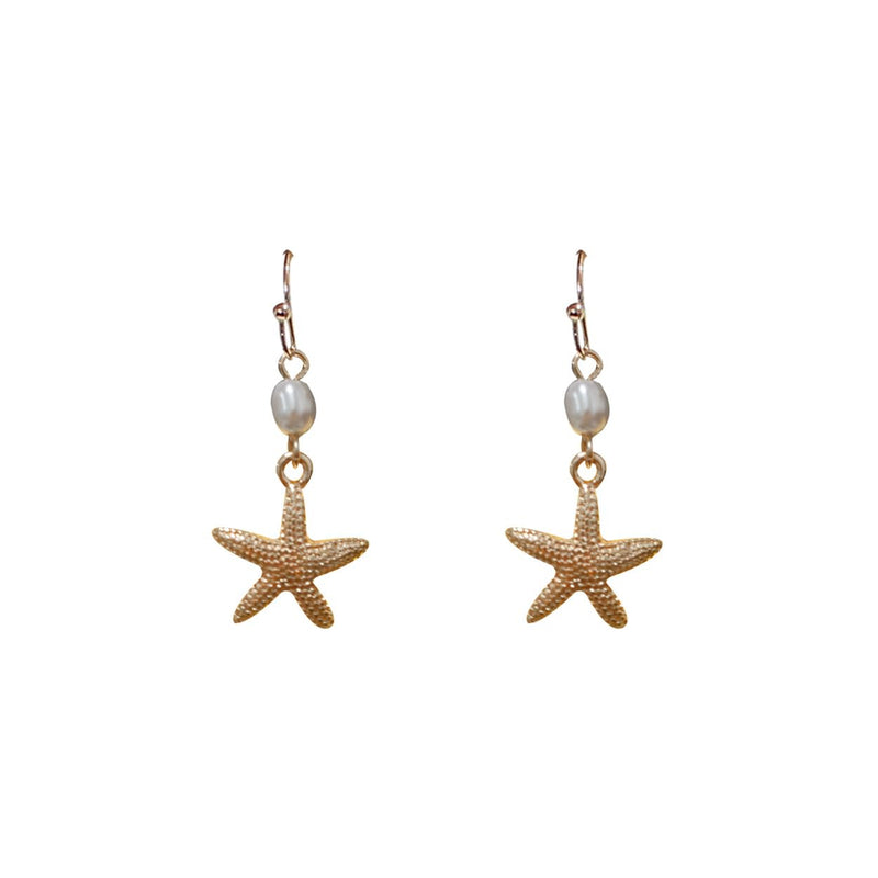 Gold Starfish Drop Earrings, 1 Inch Dangle, Beach Theme Jewelry with Pearl Accent