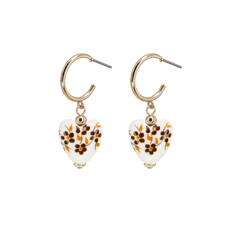 Floral Heart Dangle Earrings, Gold Tone Hoops with White Ceramic Hearts, Brown and Orange Flower Pattern 1.5 inch