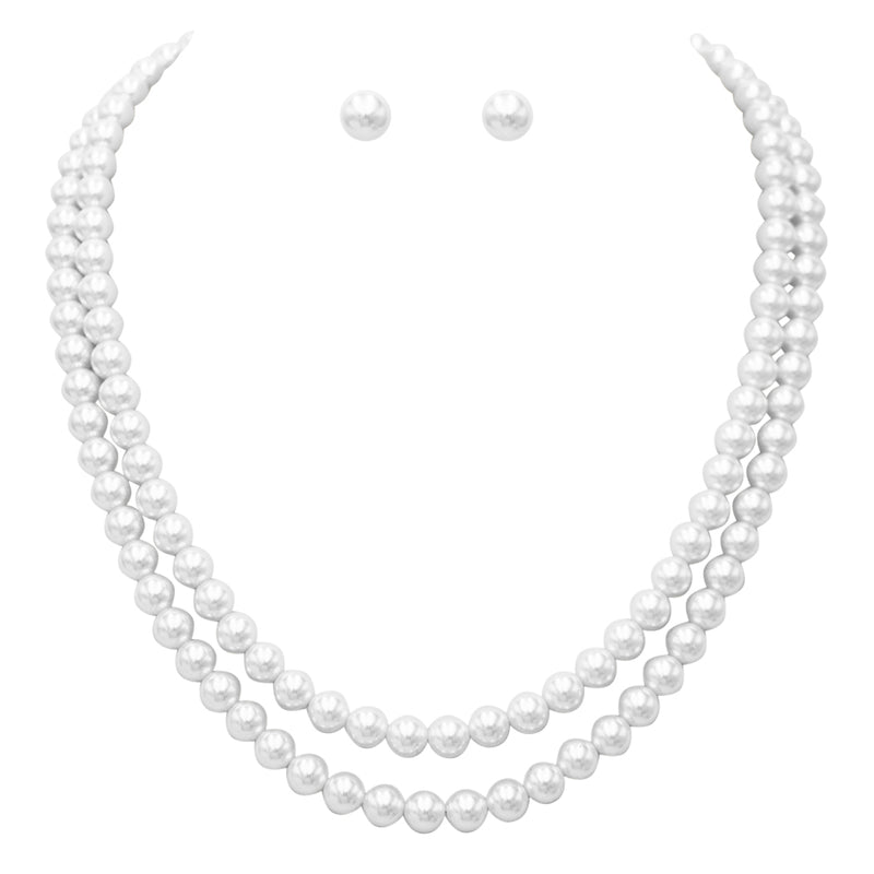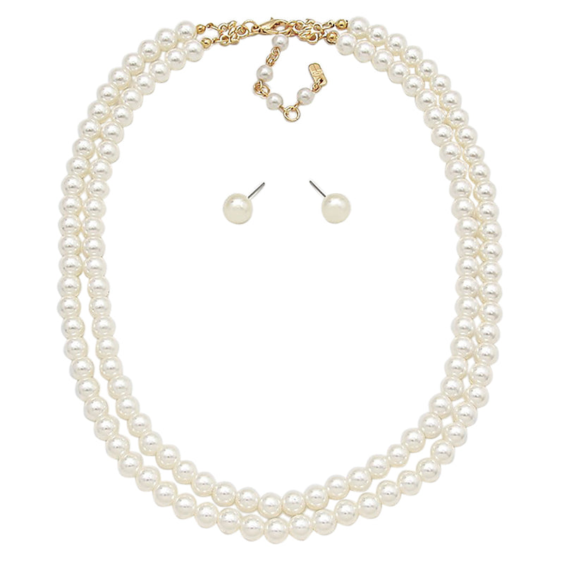 Stunning Classic Double Strand Of Simulated Pearls Necklace And Earring Gift Set, 20"+2.5" Extender