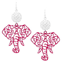 • Alabama proud with these fun and festive earrings. Drop style earrings featuring a white disco ball top of pave crystals supporting a dangling crimson colored elephant head. Intricate cutout elephant head design shows artisanal craftsmanship.
