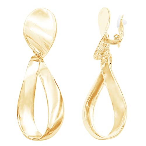 Statement Polished Gold Tone Metal Teardrop Twist Hoop Dangle Clip on Style Earrings, 3.25"